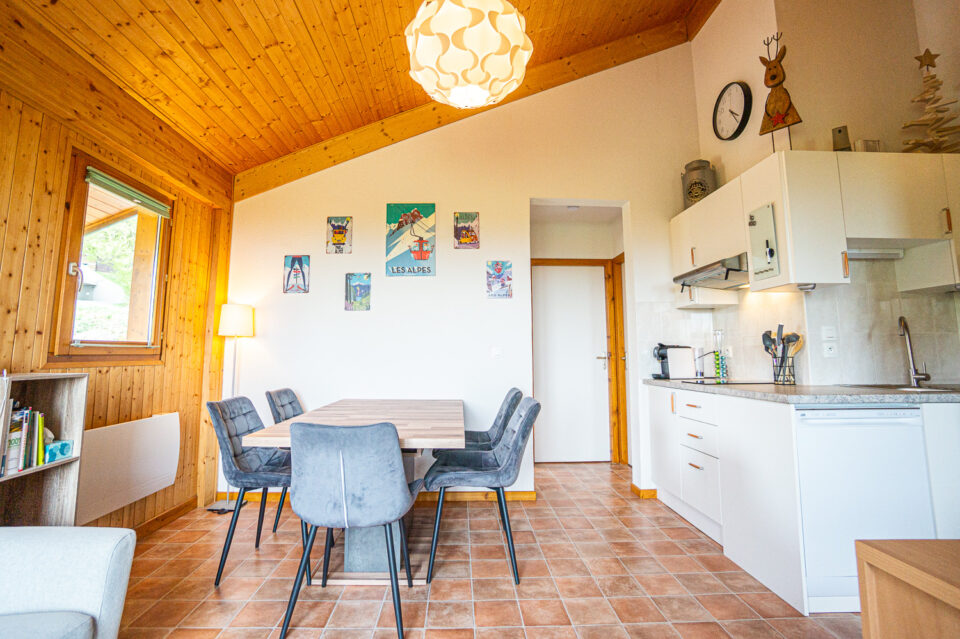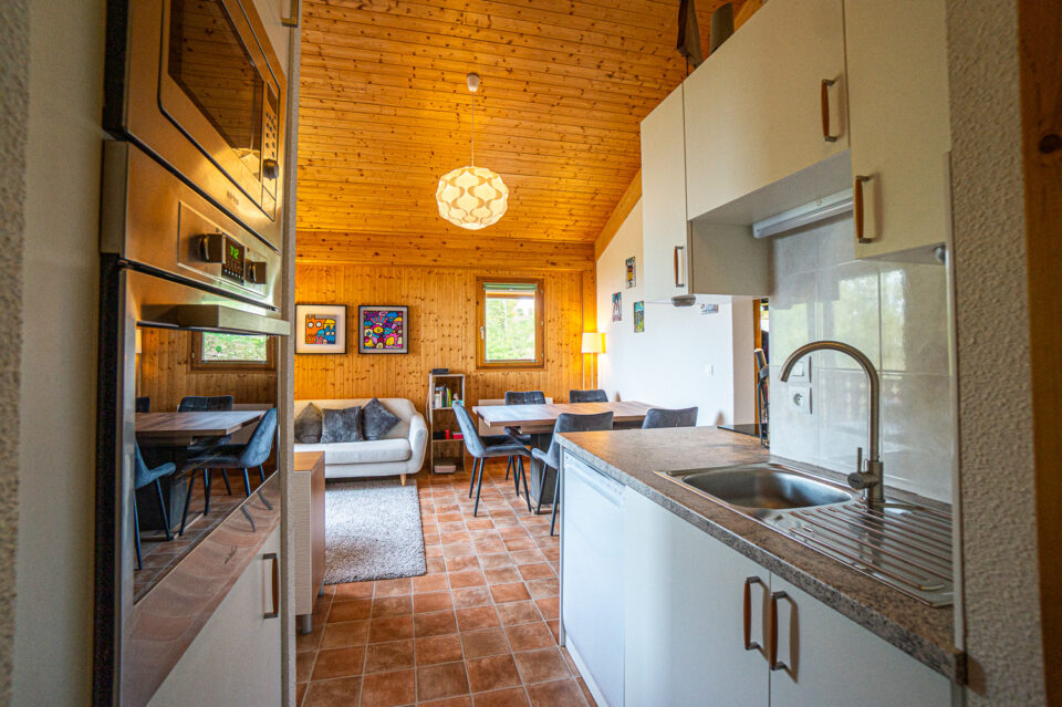 La pièce de vie ouverte accueille une cuisine entièrement équipée, prête pour les soirées raclette, fondue ou projets improvisés entre amis.